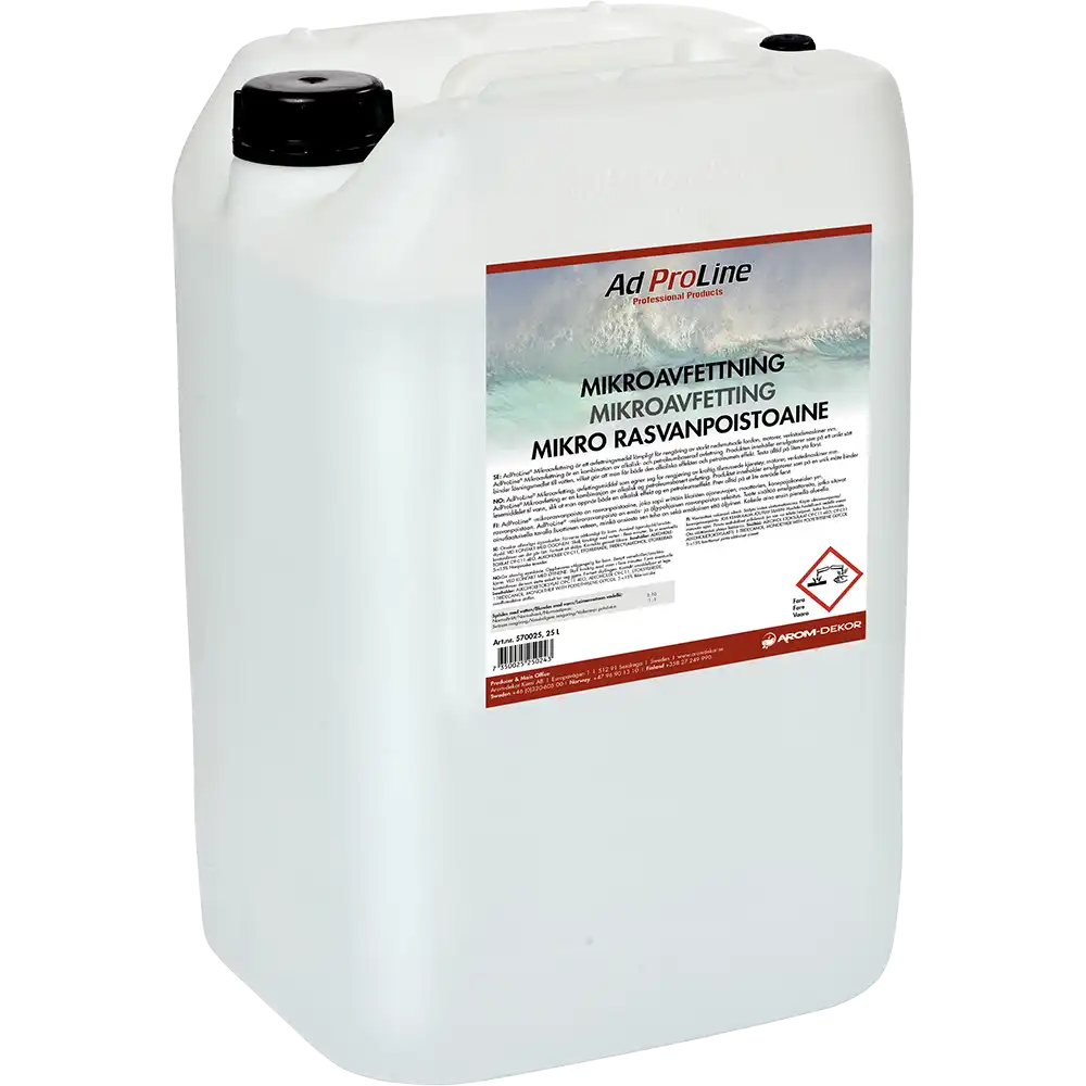 Mikroavfettning är en kombination av alkalisk- och petroleumbaserad avfettning. Produkten innehåller emulgatorer som på ett unikt sätt binder lösningsmedlet till vatten, vilket gör att man får både den alkaliska effekten och petroleumets effekt. Med Mikroavfettning kan du ersätta traditionella kallavfettningsmedel. Produkten är speciellt lämplig när man bara vill använda en produkt.