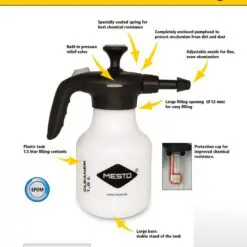 Handspruta lämplig för natronlut 20%, aceton, etanol samt starkt alkaliska medel. En idealisk spruta för industrirengöring, fordonsrengöring, desinfektion, impregnering, rostskydd och lokalvård