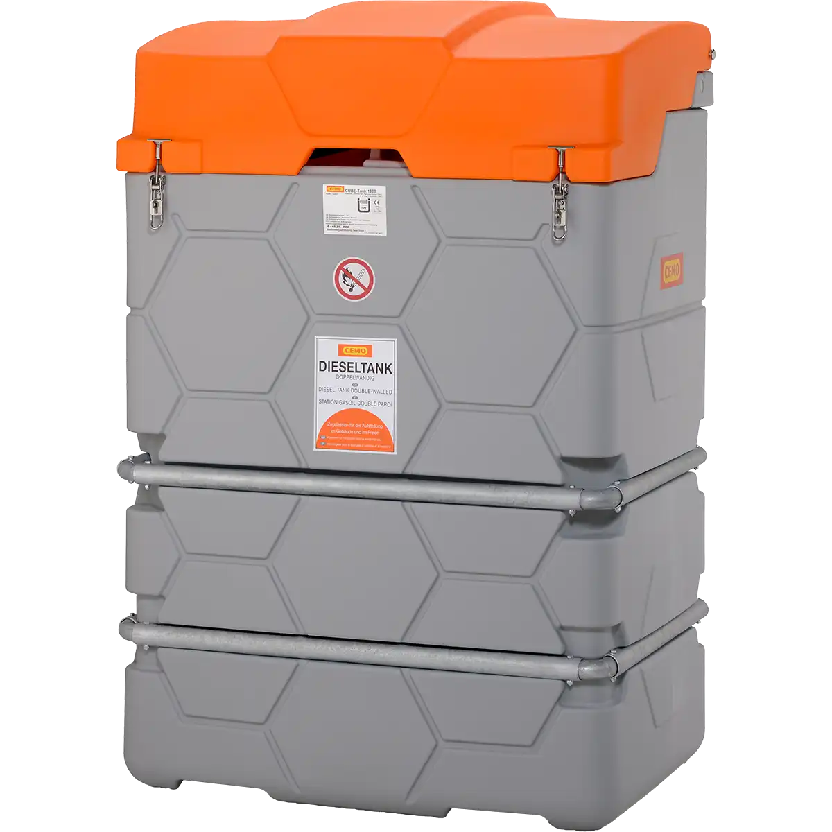 Tanken levereras komplett med nivåmätare, läckageindikator, ventilation, integrerat avrinningsstråg och tankbilskoppling. Den kan dessutom enkelt lyftas med gaffeltruck tack vare sin formade botten. Eftersom konstruktionen är i PE-plast och rostfri ram får du en lång livslängd utan oro för rost eller korrosion.